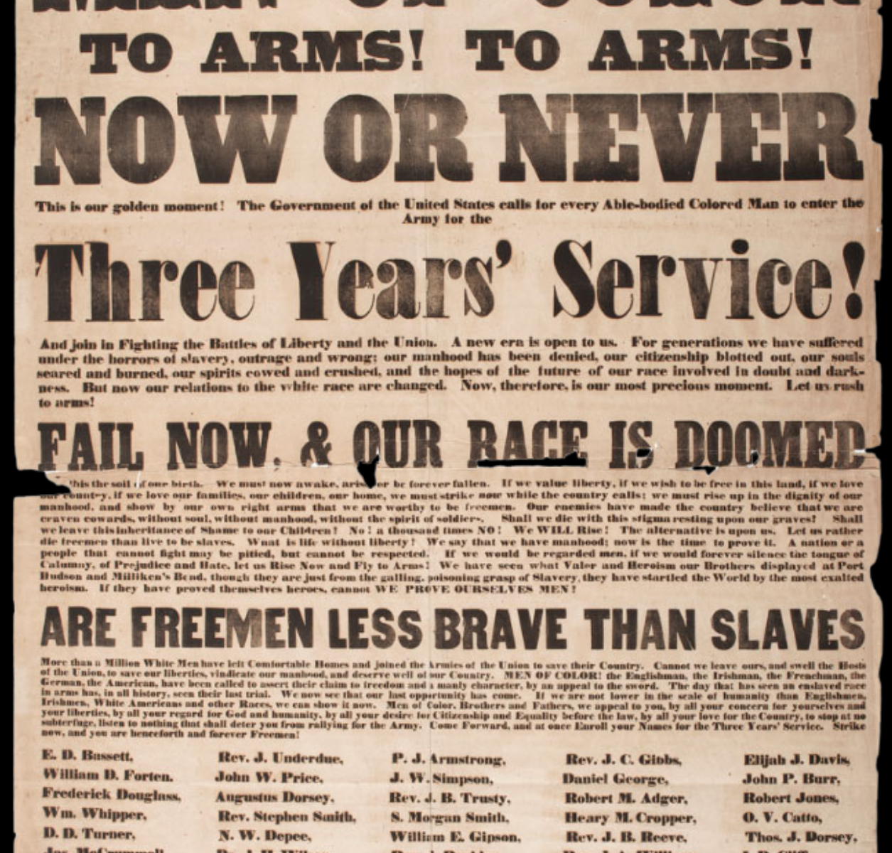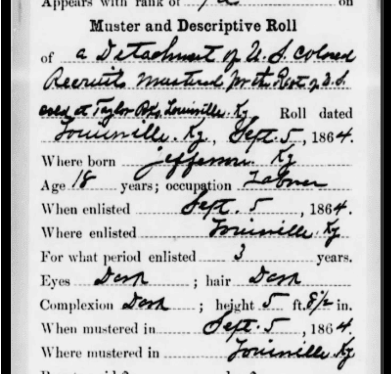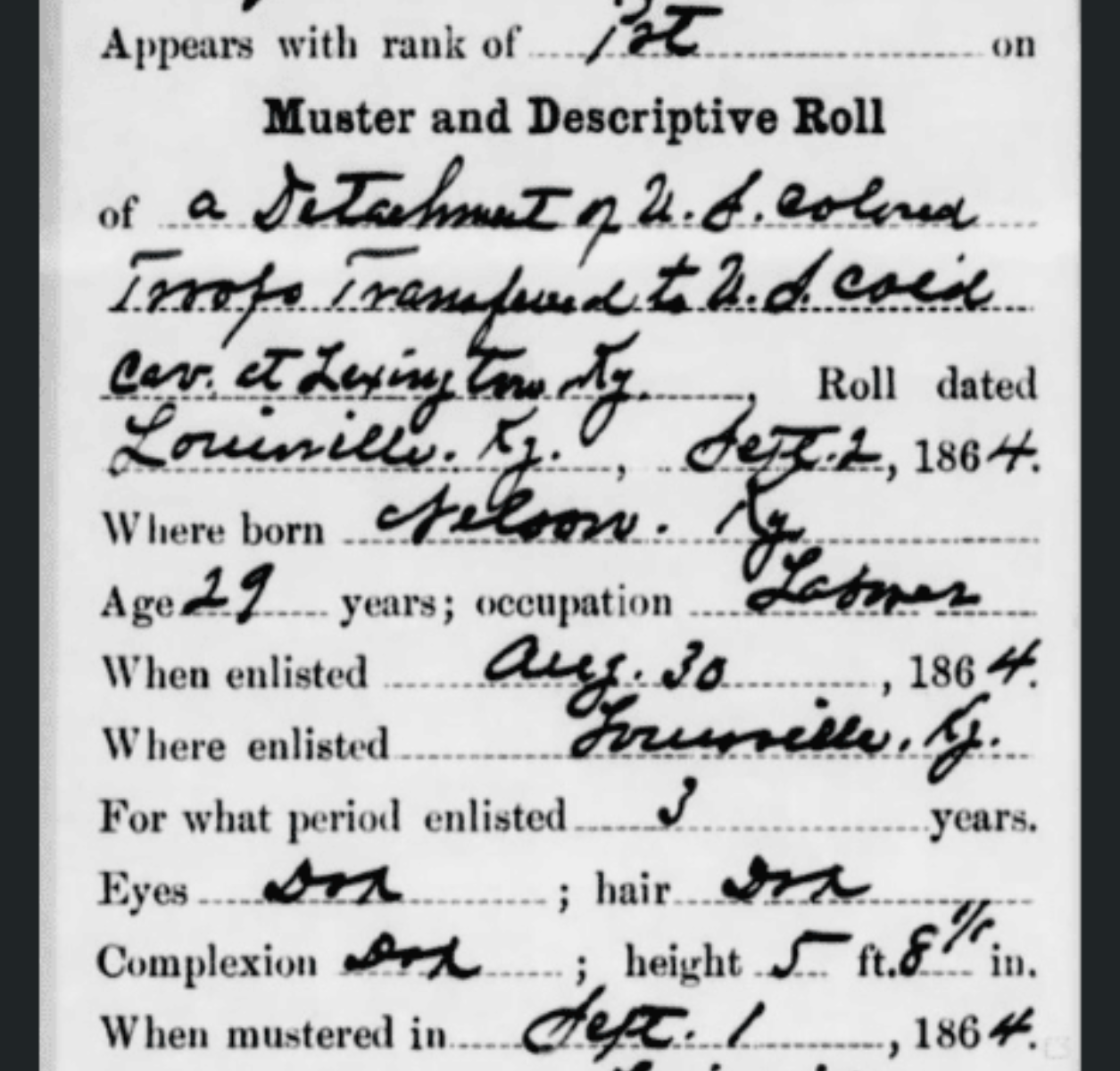 He enlisted in the Union Army at age 44 on April 12, 1865 “without consent” of his owner, Jane Edelen, a month after an act of congress guaranteed the emancipation of the families of all slaves who enlisted. He also had the additional incentive of earning a $100 bounty and $300 total at the completion of three-years of service for volunteering.