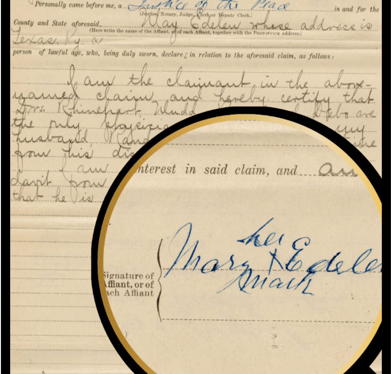 The Edelen family’s challenges that were documented in 90 pages of pension files, military service records, census records, and Freedman’s bank notes, were simultaneously uplifting and heartbreaking to read. The most moving part was getting to see Mary Edelen, my 3rd Great-great grandmother’s mark on multiple documents and most powerfully on the affidavit where two of her own children serve as witnesses. Seeing the X in place of her signature made the X, from a legal name change in my own name, even more significant. It was as if my ancestors had been speaking to me from across time.